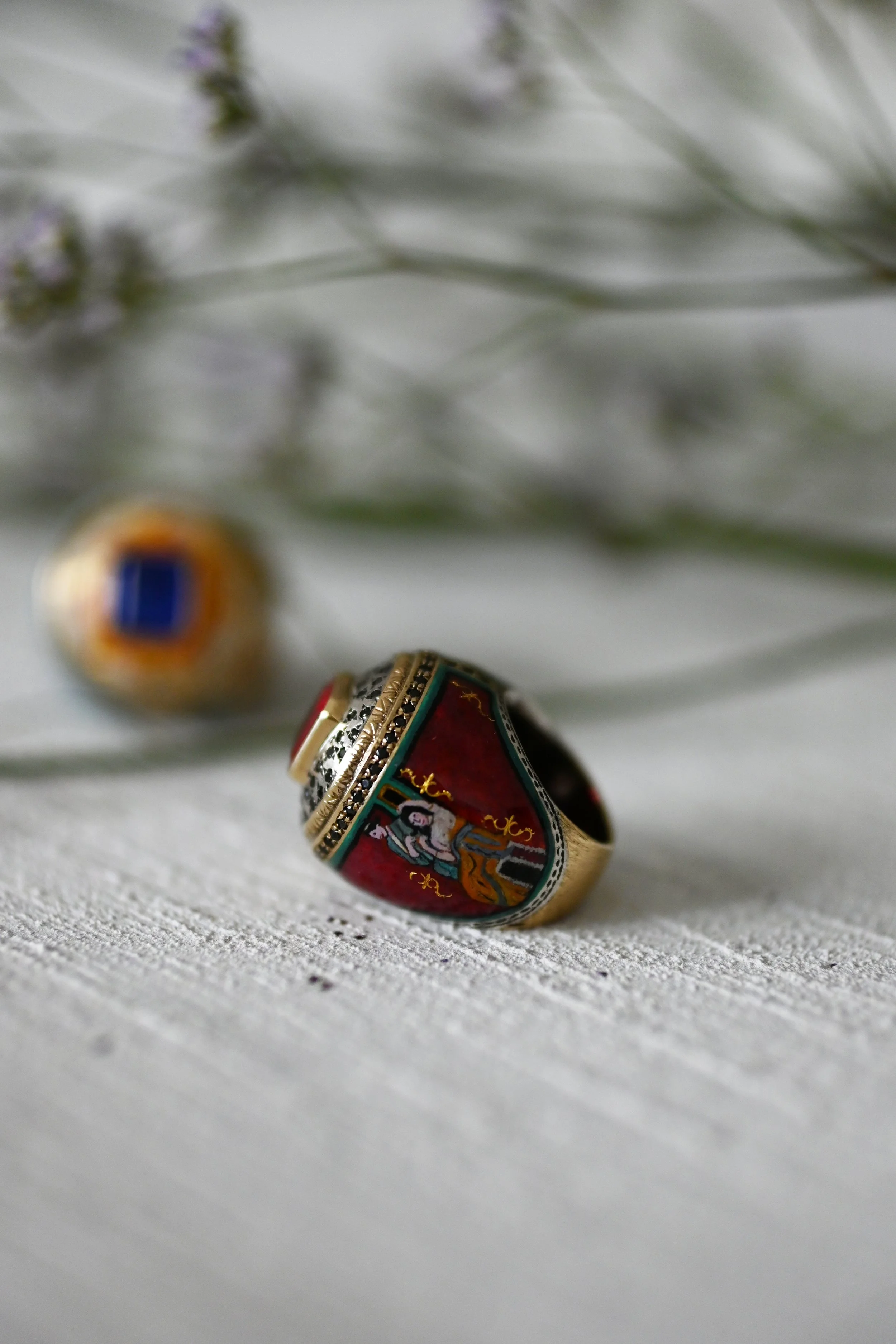 Anello Paradise Lost, oro, argento, diamanti bianchi, paglioni oro zecchino e smalto a freddo