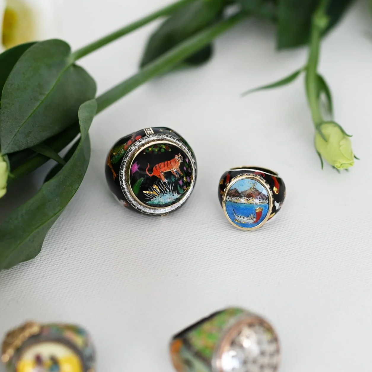 Elemento distintivo e narrativo del brand è la storia in miniatura smaltata, che si fonde con oro, argento e diamanti per dare vita a creazioni che superano il concetto di gioiello: